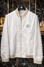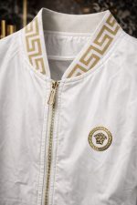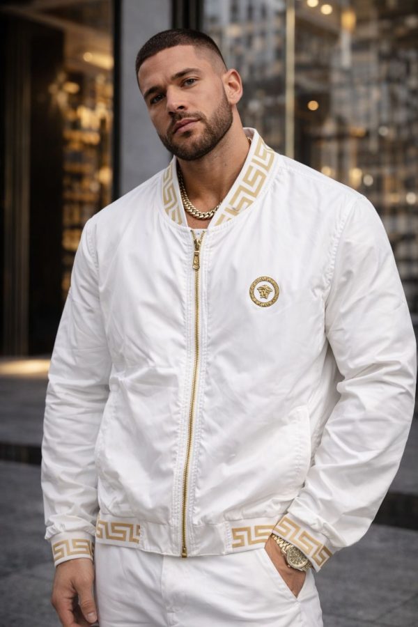 NOVIDADE! Jaqueta bomber Versa, caracterizada pelo icônico design com detalhes dourados e o logotipo da Medusa. Esta peça é descrita como um item premium que combina luxo e estilo urbano.