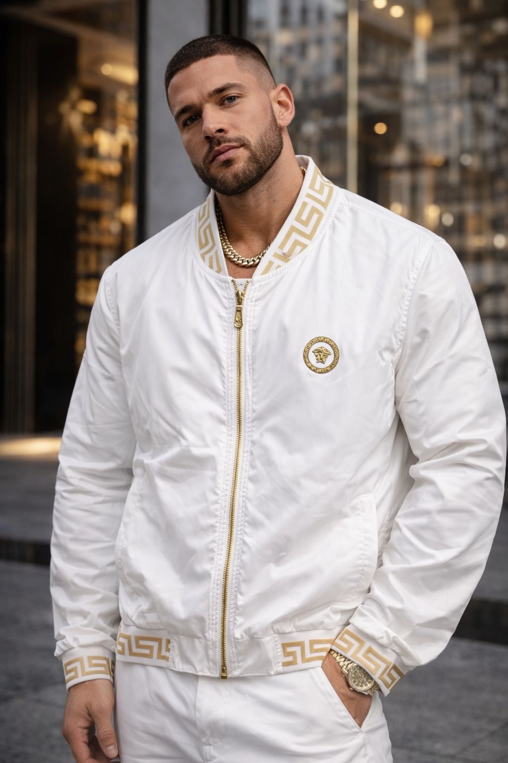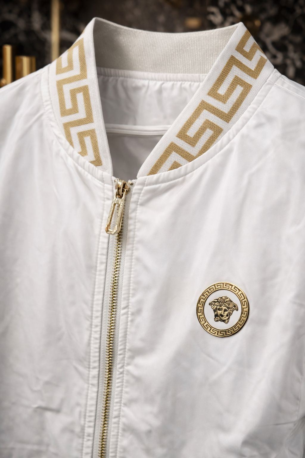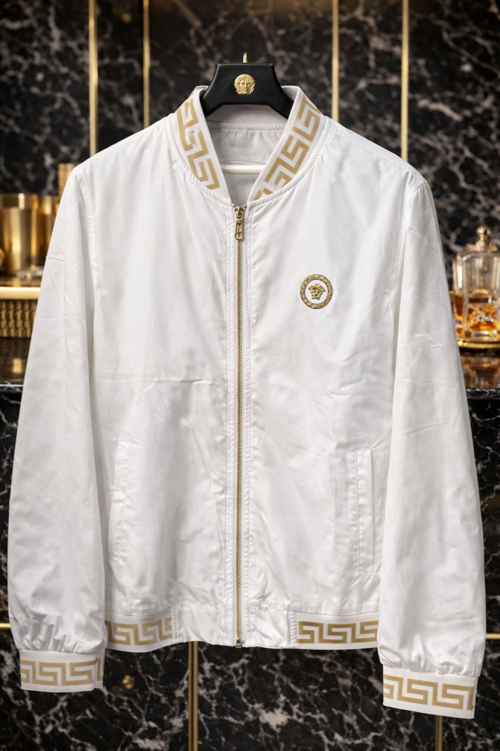 Greca (Greek Key): Padronagem clássica da Versace presente na gola, punhos e barra da jaqueta.