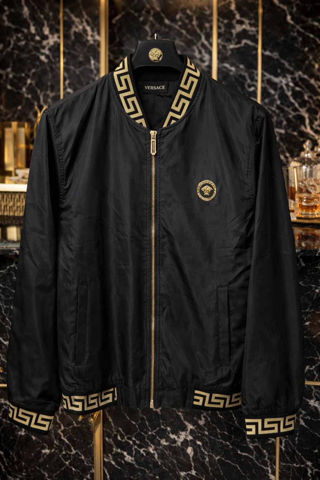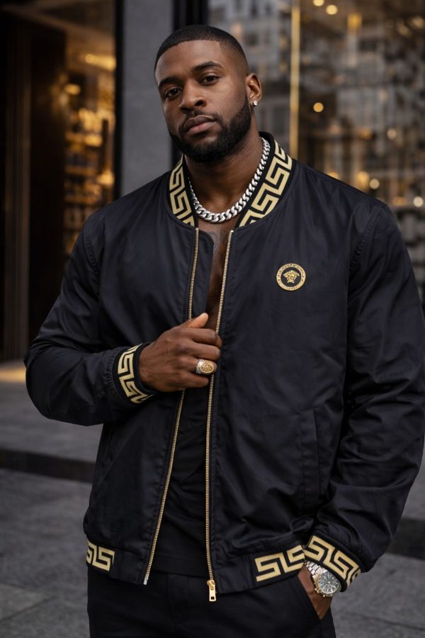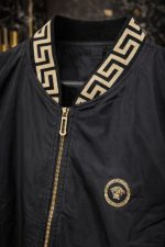 NOVIDADE! Jaqueta bomber Versa, caracterizada pelo icônico design com detalhes dourados e o logotipo da Medusa. Esta peça é descrita como um item premium que combina luxo e estilo urbano.