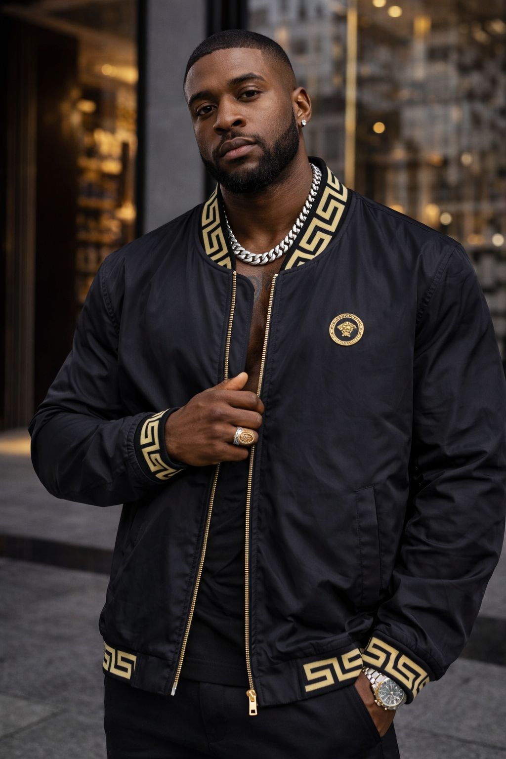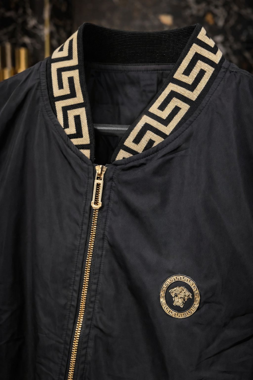 Greca (Greek Key): Padronagem clássica da Versace presente na gola, punhos e barra da jaqueta.