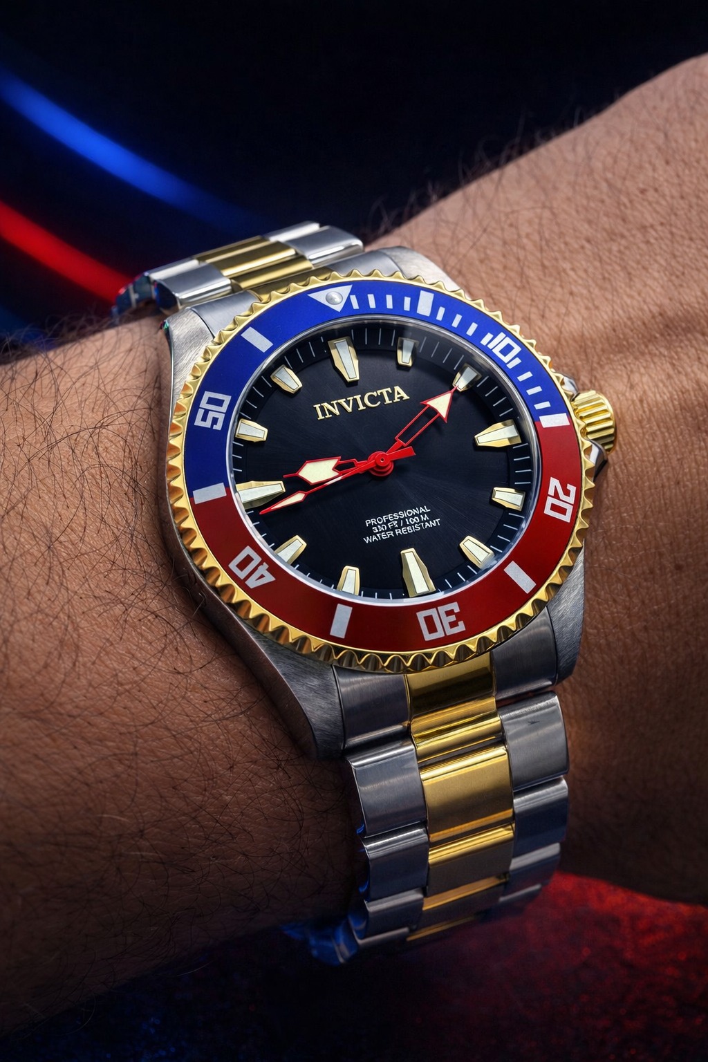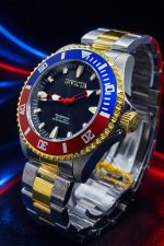 -56%Invicta Pro Diver, modelo 46649. Este modelo masculino é caracterizado pelo seu design robusto, apresentando um mostrador preto e o clássico bisel “Pepsi” nas cores azul e vermelho.