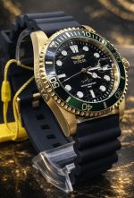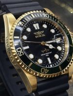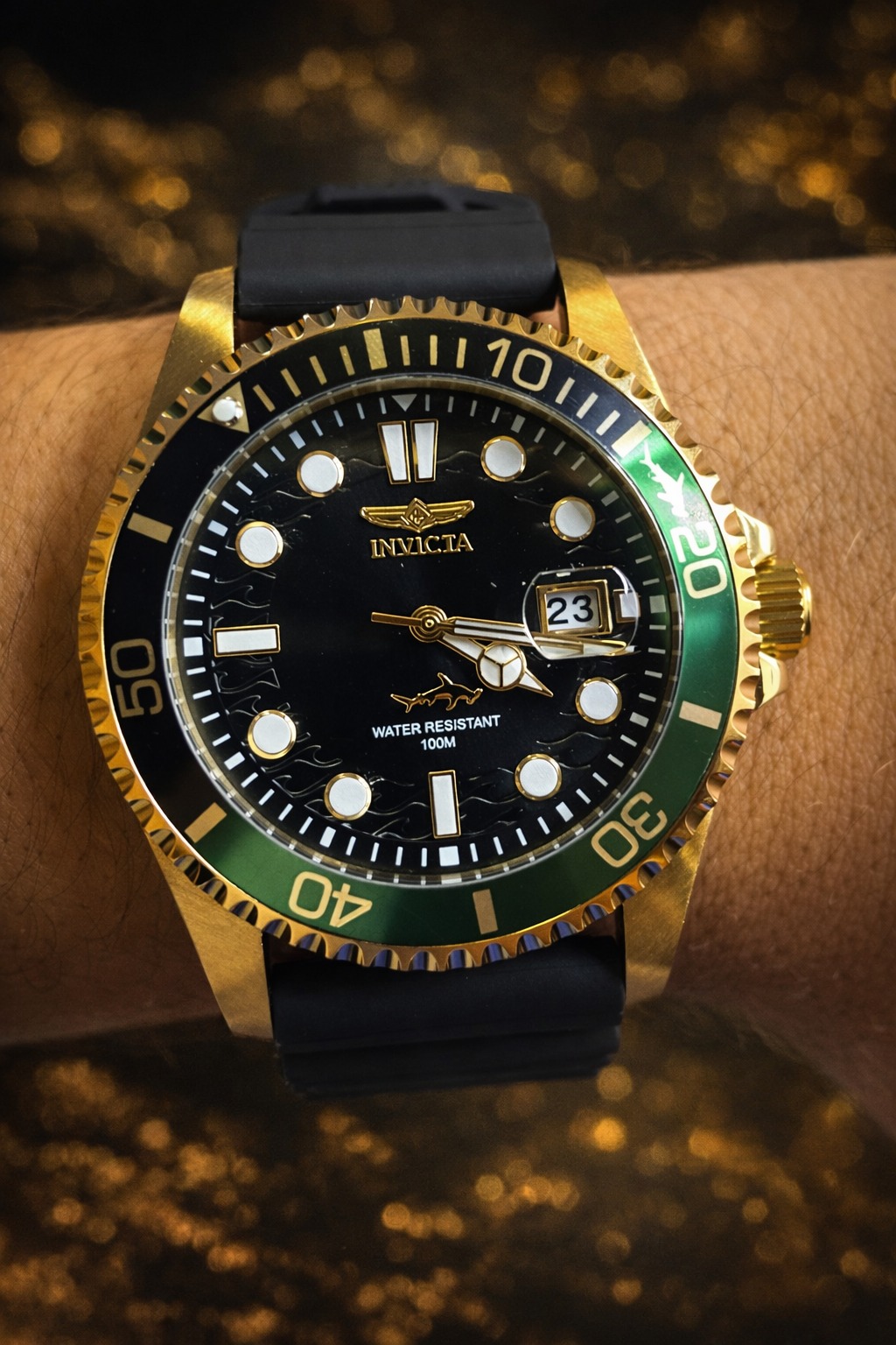Design: Mostrador preto com detalhes em dourado e um bisel (aro) verde e preto.