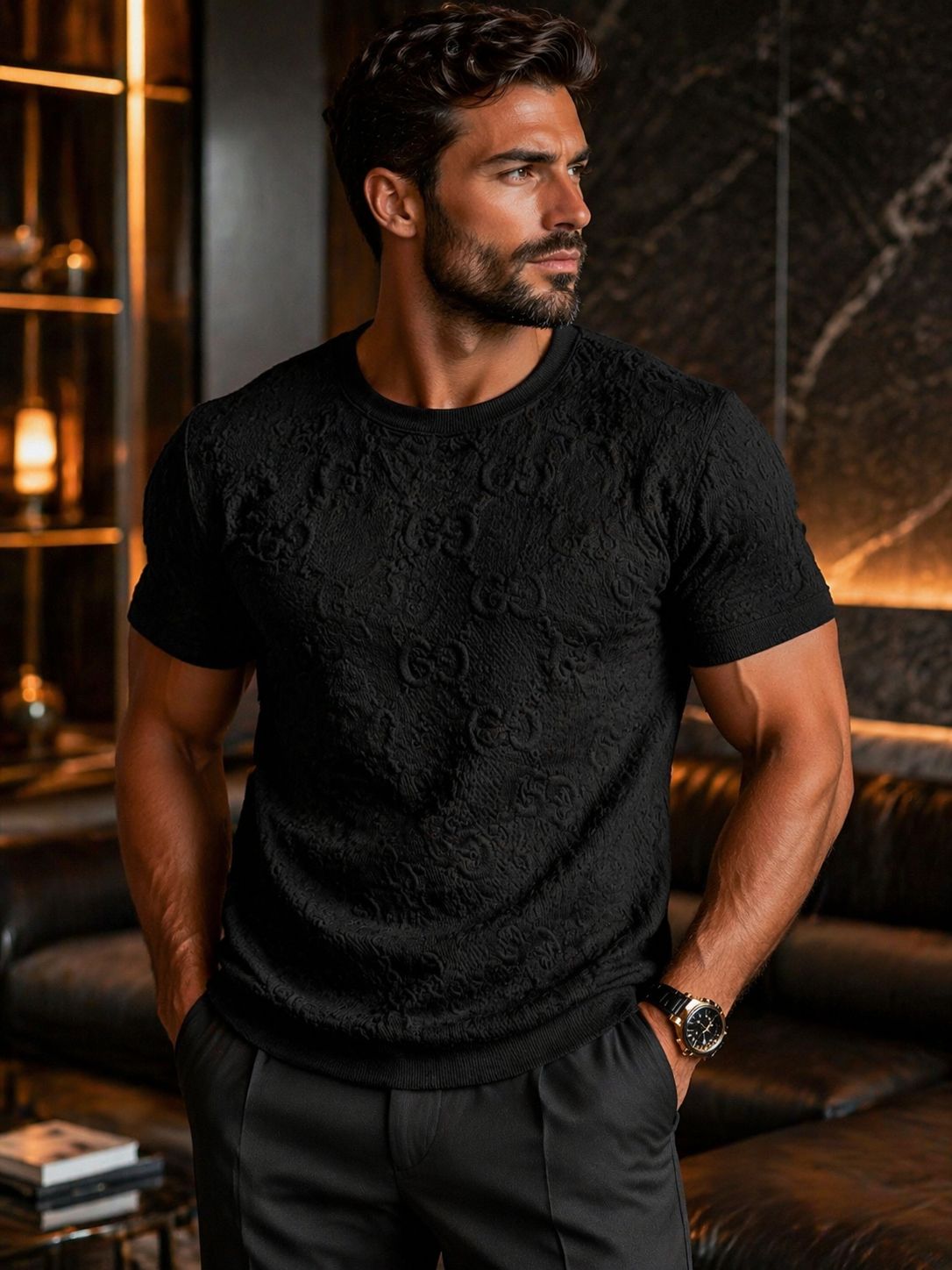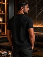 A camiseta texturizada premium preta é a definição de elegância moderna. Com um acabamento sofisticado em relevo e padrão exclusivo, ela entrega um visual imponente, discreto e extremamente refinado — perfeita para quem valoriza presença sem esforço.
