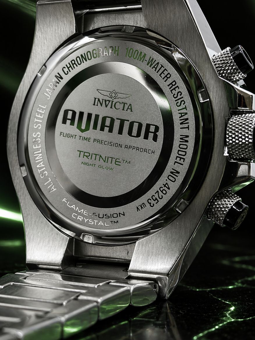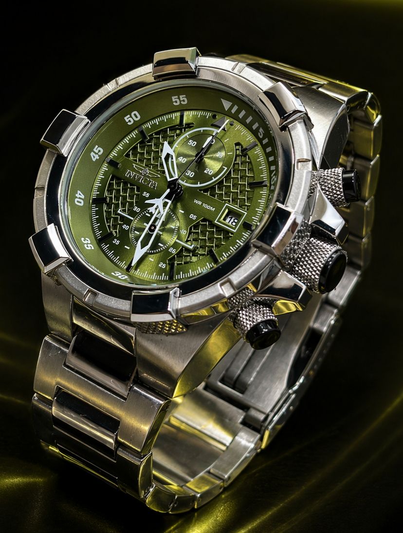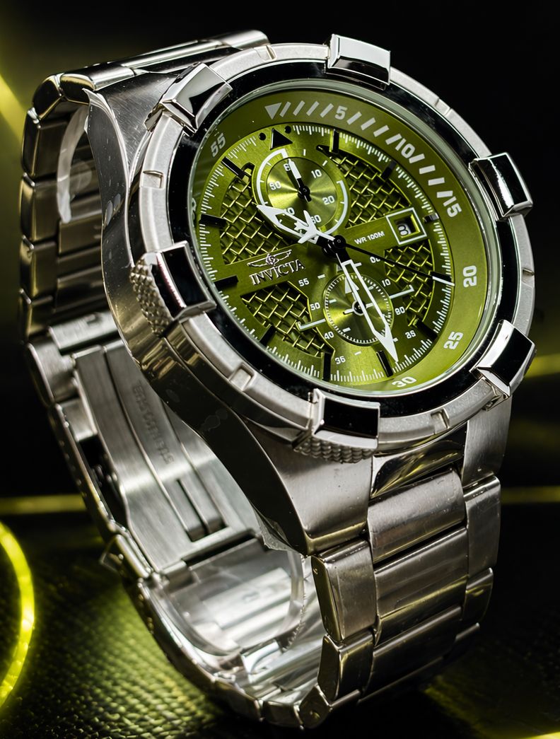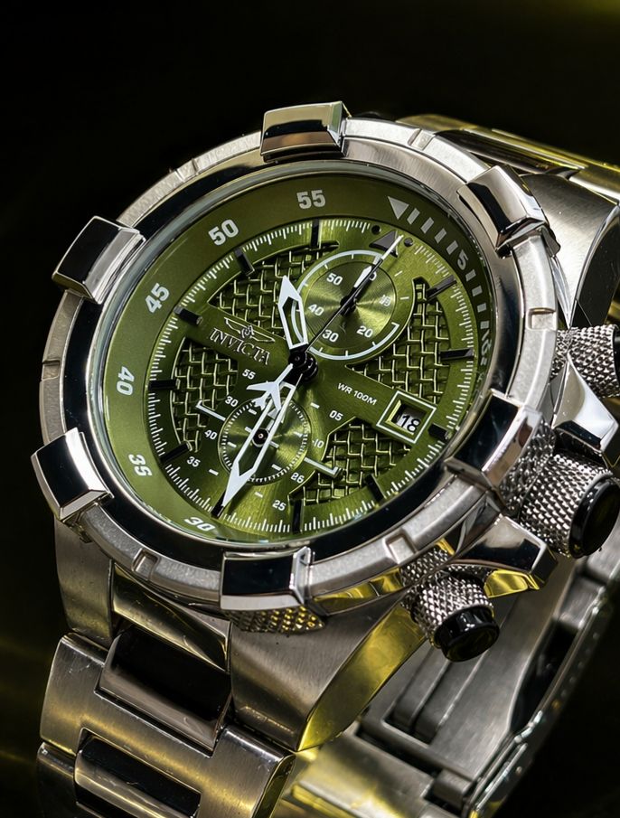 - Mostrador: Cor verde com marcadores luminosos e detalhes em padrão de “rede”.