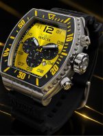 - Caixa: Design tonneau em aço inoxidável e alumínio, com acabamento prateado e detalhes em preto e amarelo no aro.