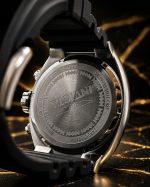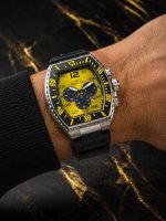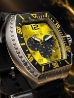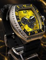 - Mostrador: Amarelo com textura ondulada, apresentando submostradores pretos para a função de cronógrafo e uma janela de data entre as 4 e 5 horas.