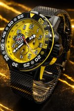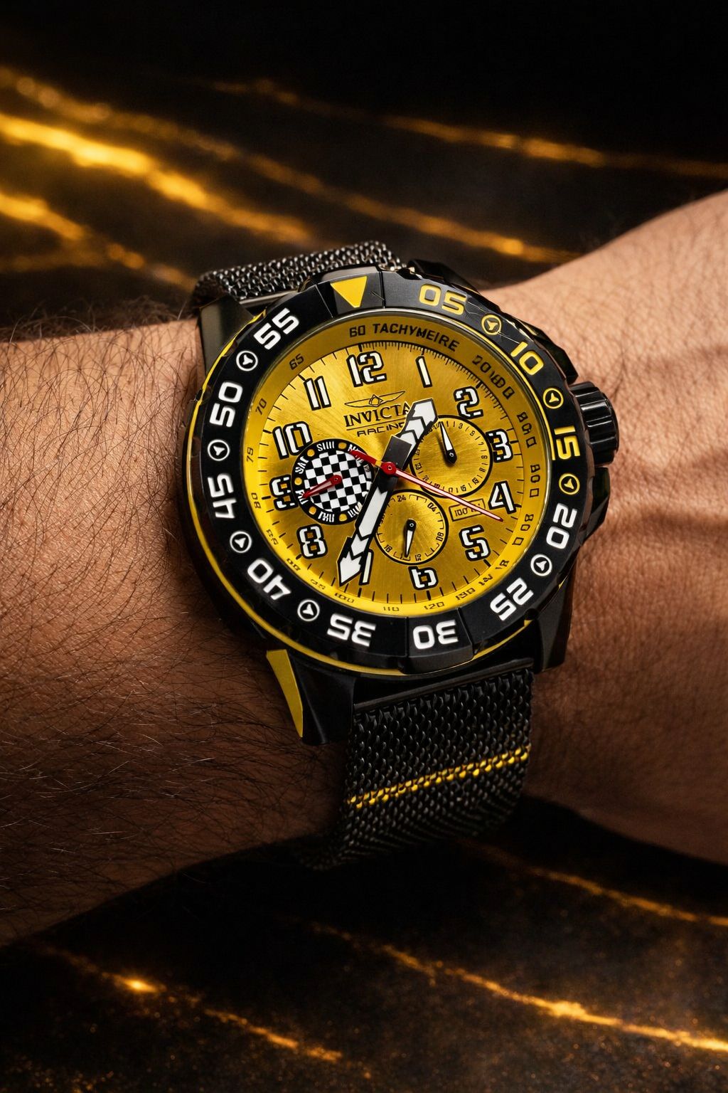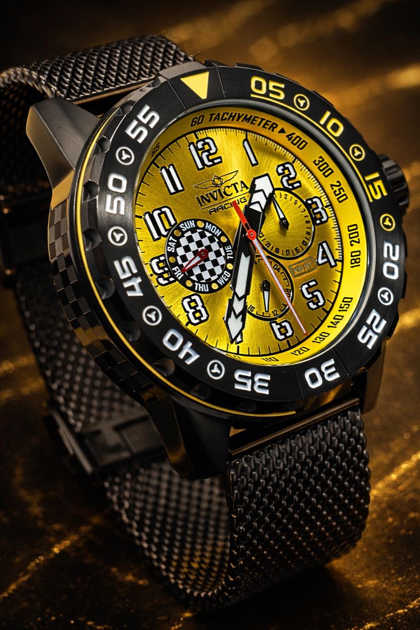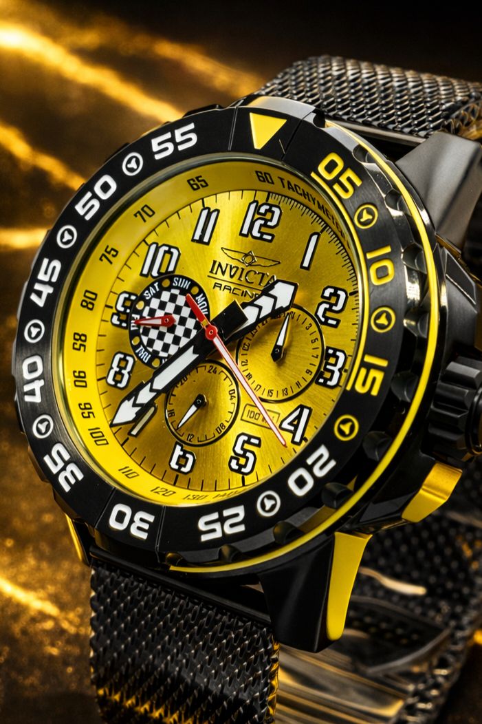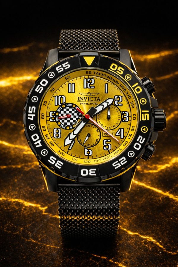 -56%Invicta Racing Dynox (modelo 47215), um modelo unissex de 48 mm projetado com uma estética inspirada no automobilismo. Ele apresenta uma combinação vibrante de cores preta e amarela, com uma pulseira de malha de aço inoxidável (estilo mesh) preta.