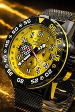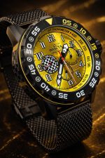 - Design do Mostrador: Fundo amarelo com marcadores numéricos grandes e um gráfico de bandeira quadriculada, reforçando o tema de corrida.