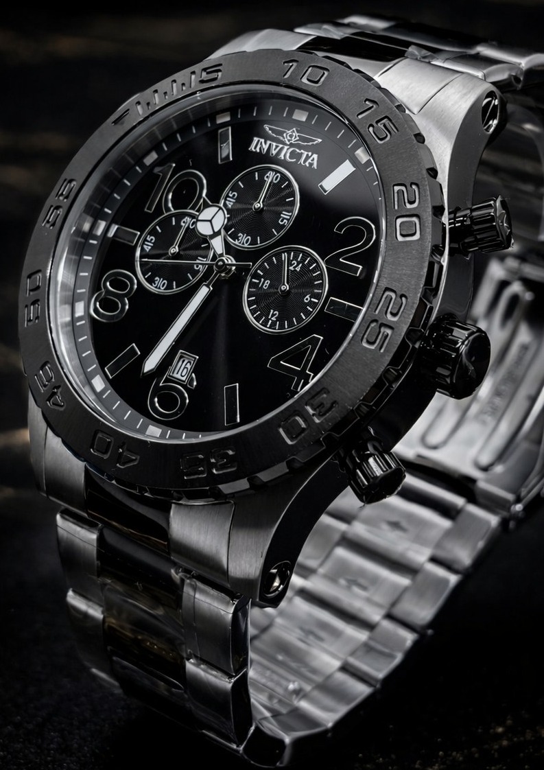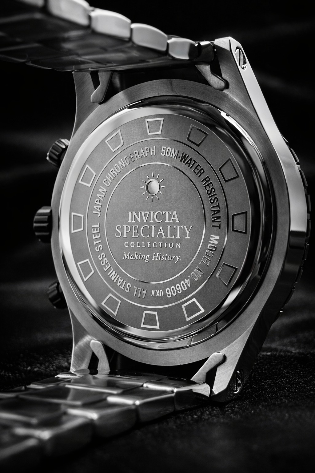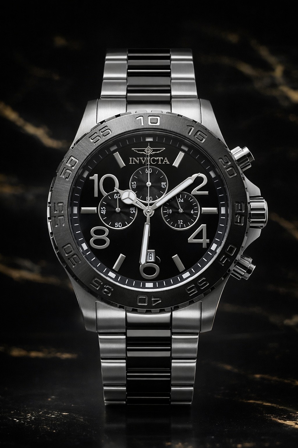 -56%Este relógio é o Invicta Specialty Chronograph (Modelo 40606), um modelo masculino robusto que combina um acabamento em aço inoxidável prateado com detalhes em preto.