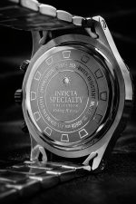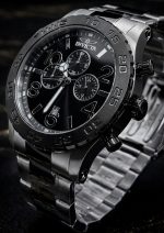- Funcionalidades: É um cronógrafo com três submostradores (60 segundos, 60 minutos e 24 horas) e exibição de data na posição de 6 horas.