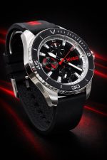 Funcionalidades: Inclui movimentos de quartzo, cronógrafo e exibição de 24 horas. Os botões laterais contam com capas protetoras de silicone vermelhas.