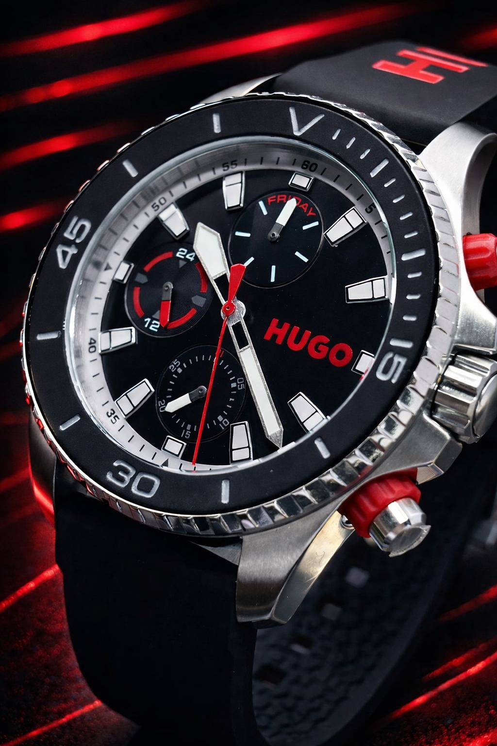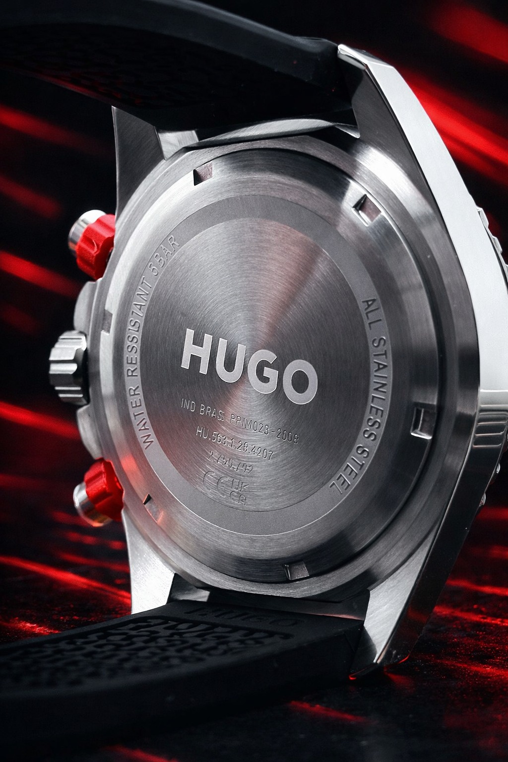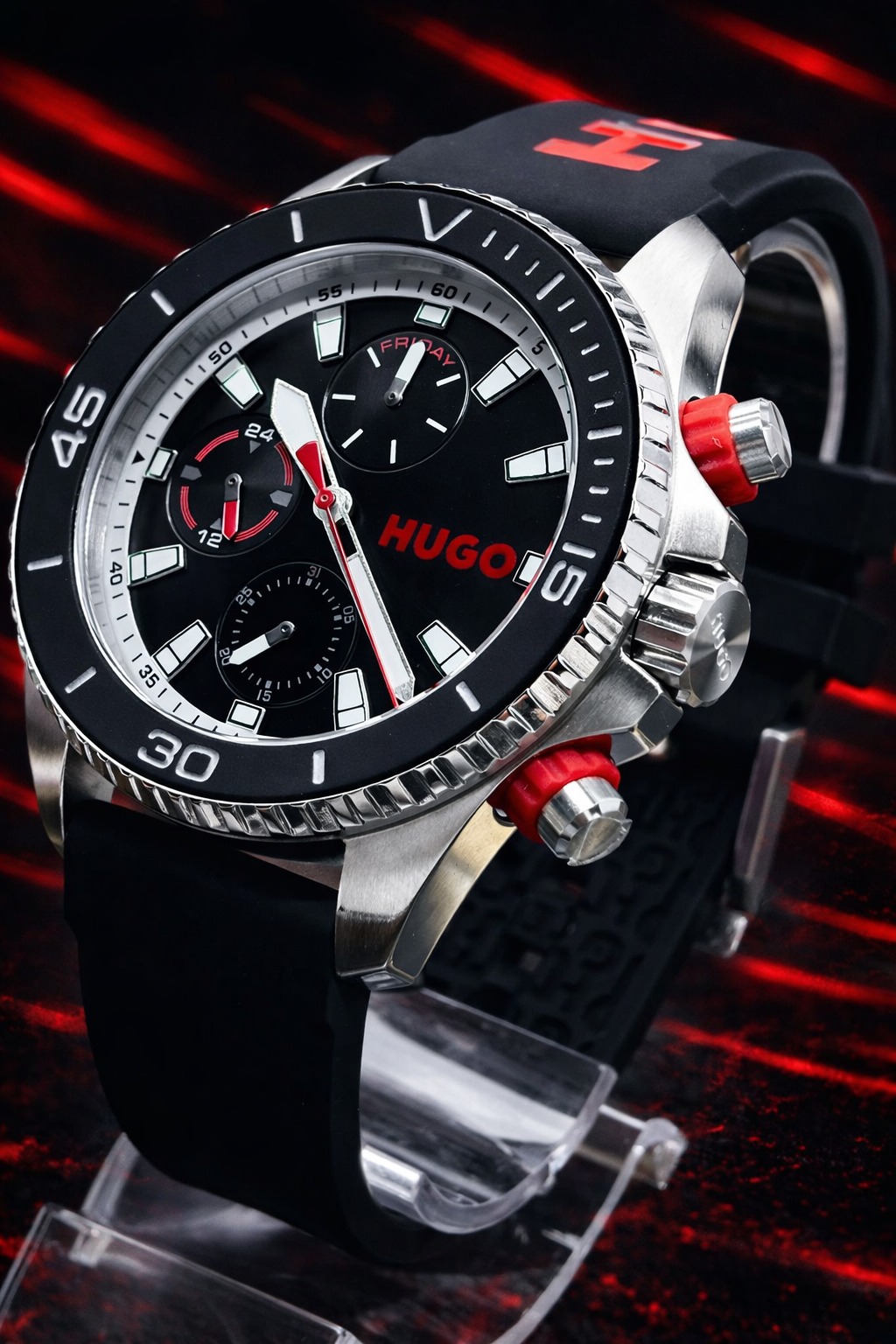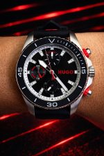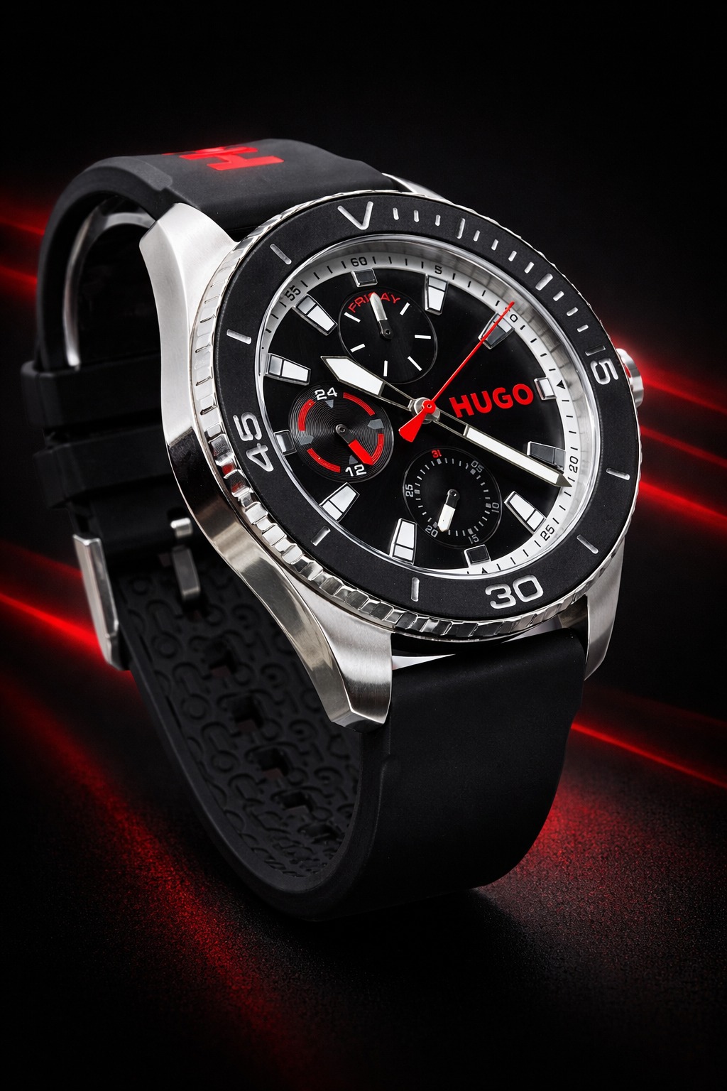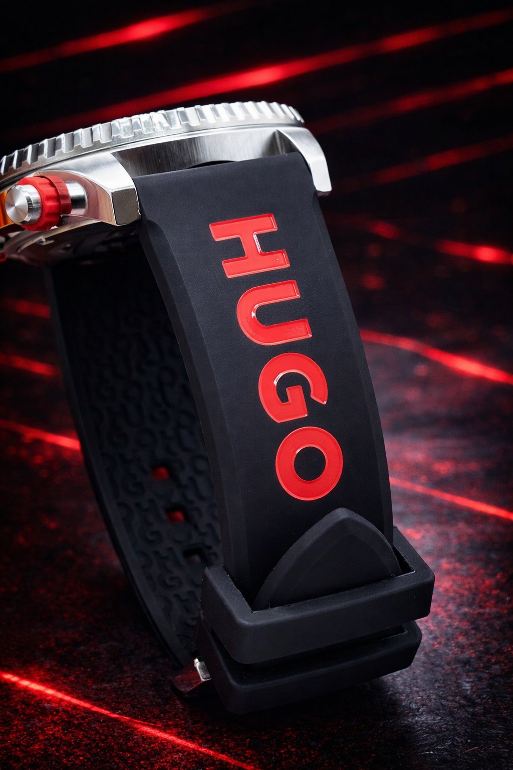 Pulseira: Feita de silicone preto com o logotipo da marca HUGO em destaque, fechada por uma fivela de pino.