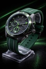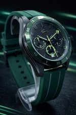 Pulseira: Silicone verde com detalhes texturizados.