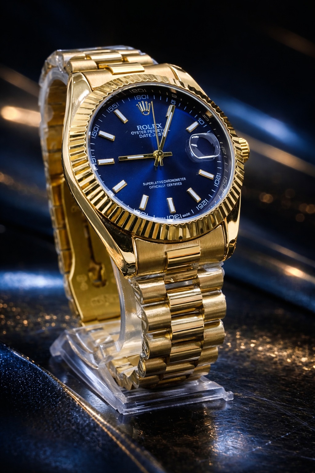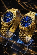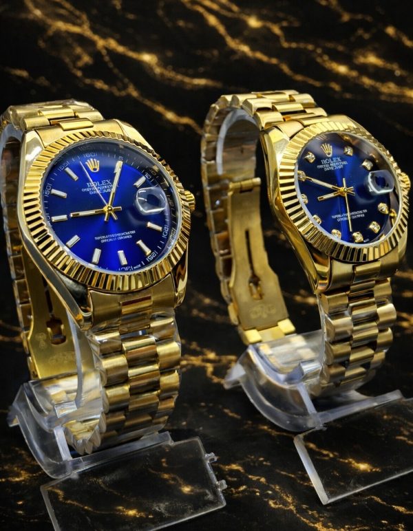 KIT CASAL LUXO ECONOMIA💎 RLX Dourado Detalhes Mostrador Azul Masculino e Feminino + FRETE GRÁTIS (TEMPO LIMITADO) ✨