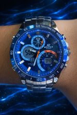 -60%Edifice, um modelo masculino conhecido pelo design esportivo e robusto que combina elementos analógicos e digitais.